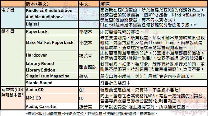 Kindle 中文和解釋 Kindle Edition 中文和解釋Audible Audiobook 中文和解釋Digital 中文和解釋Paperback中文和解釋 Mass Market Paperback中文和解釋 Hardcover 中文和解釋Library Bound Library Edition中文和解釋 Single Issue Magazine中文和解釋 Staple Bound 中文和解釋Audio CD 中文和解釋MP3 CD 中文和解釋Audio, Cassette