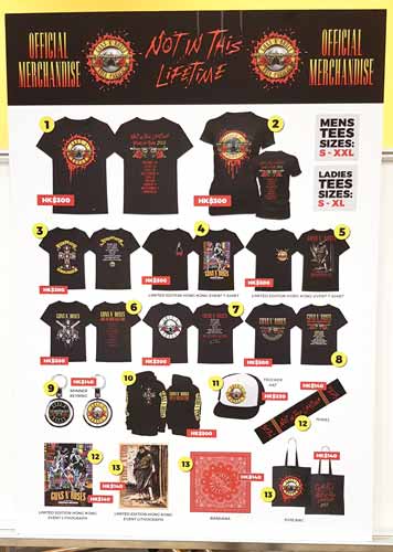 左邊的是11/20,喜歡這張,後面的街景是香港特色的大霓虹燈中文字招牌,橫跨在路上那種的,巧思是中文字都是GNR的歌名中譯(雖然就選幾首不停重複),前面是Axl,Slash和Duff的全身骷髏在performing。本圖還有出衣服,骷髏保留Axl和Duff的背貼背表演,可惜賣完了。