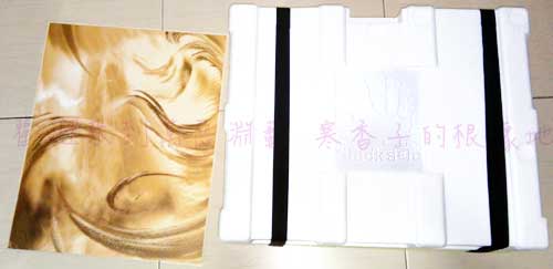 開箱。拉出一張三折式背景圖(而且沒壓凹) 保麗龍箱附帶2條魔鬼氈。