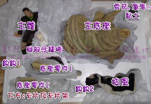 薄紙全打開。原本以為這次零件只有2個鈎鈎、一個小沙龍捲、底台(3零件組合)、社長、披風。
